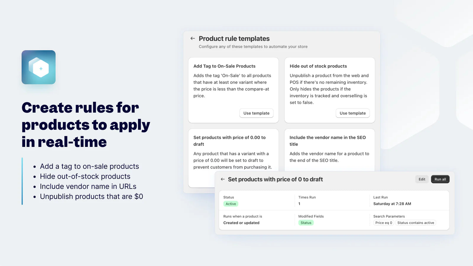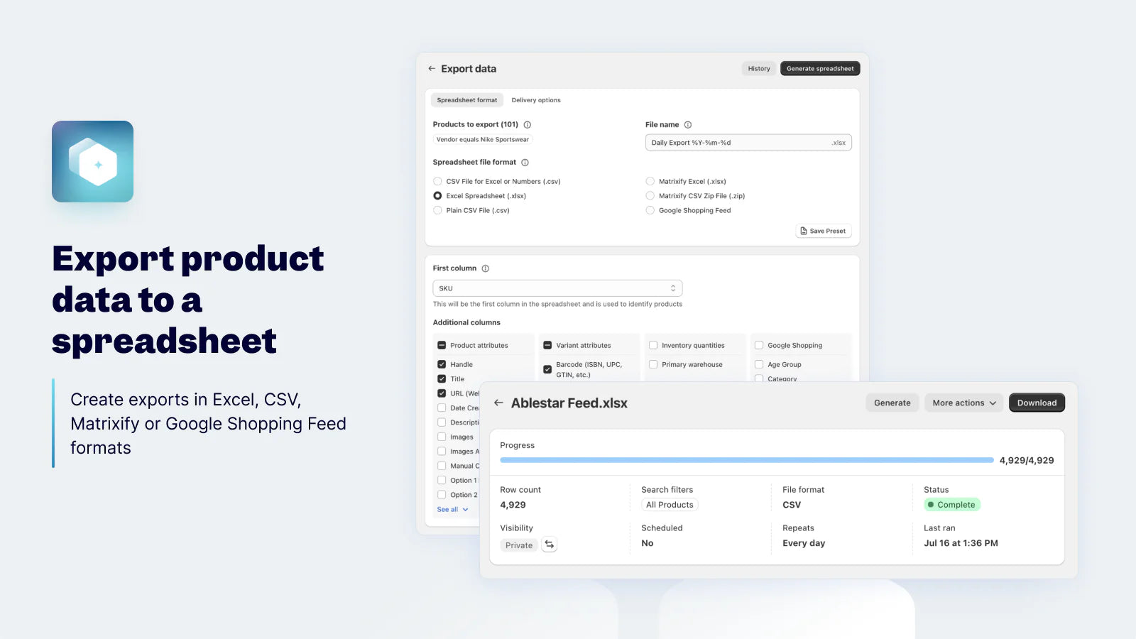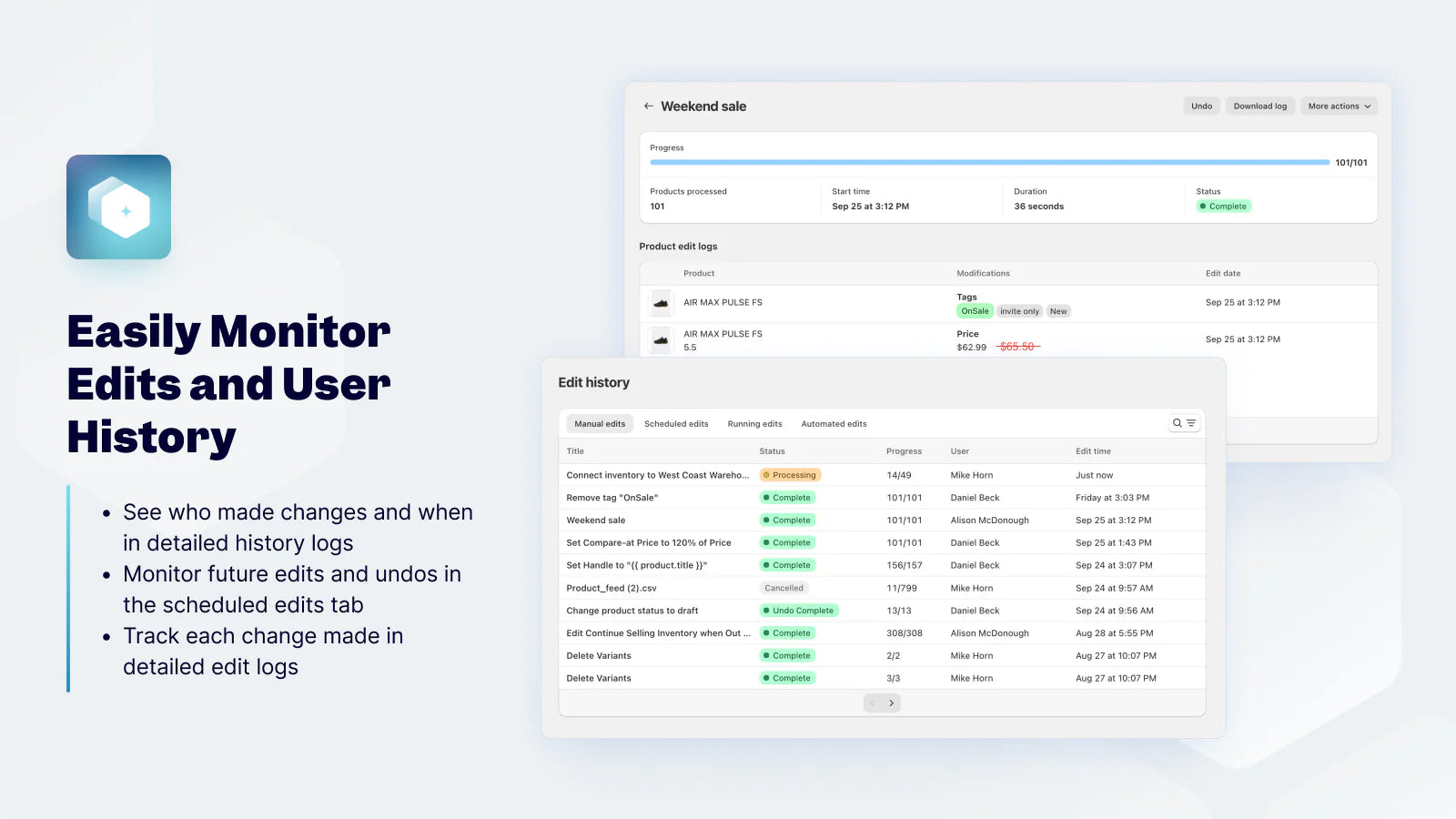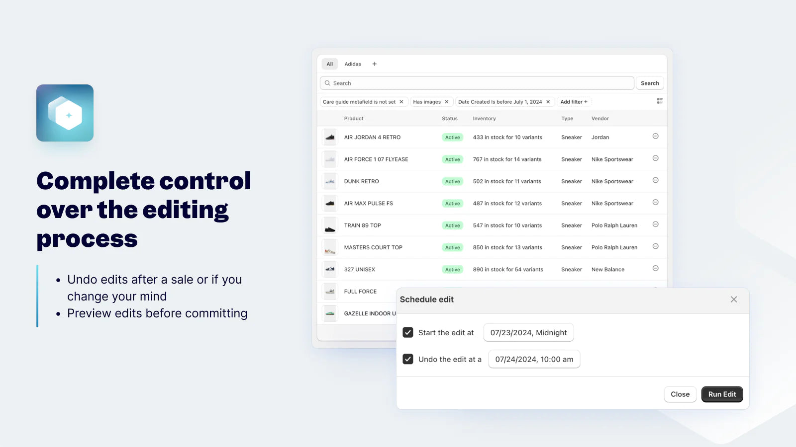 Ablestar Bulk Product Editor simplifies Shopify product management by enabling bulk edits with precision and control. Effortlessly update thousands of products, prices, collections, and more—saving time and reducing errors. With features like previews, progress monitoring, and an undo button, you can confidently make changes and even revert edits after a sale ends. Upload spreadsheets or automate edits to streamline operations. Track edits with version control, sync inventory from Google Drive, Dropbox, or FTP, and quickly export product data in CSV or Excel. Perfect for bulk pricing updates, scheduled sales, and accurate inventory management.