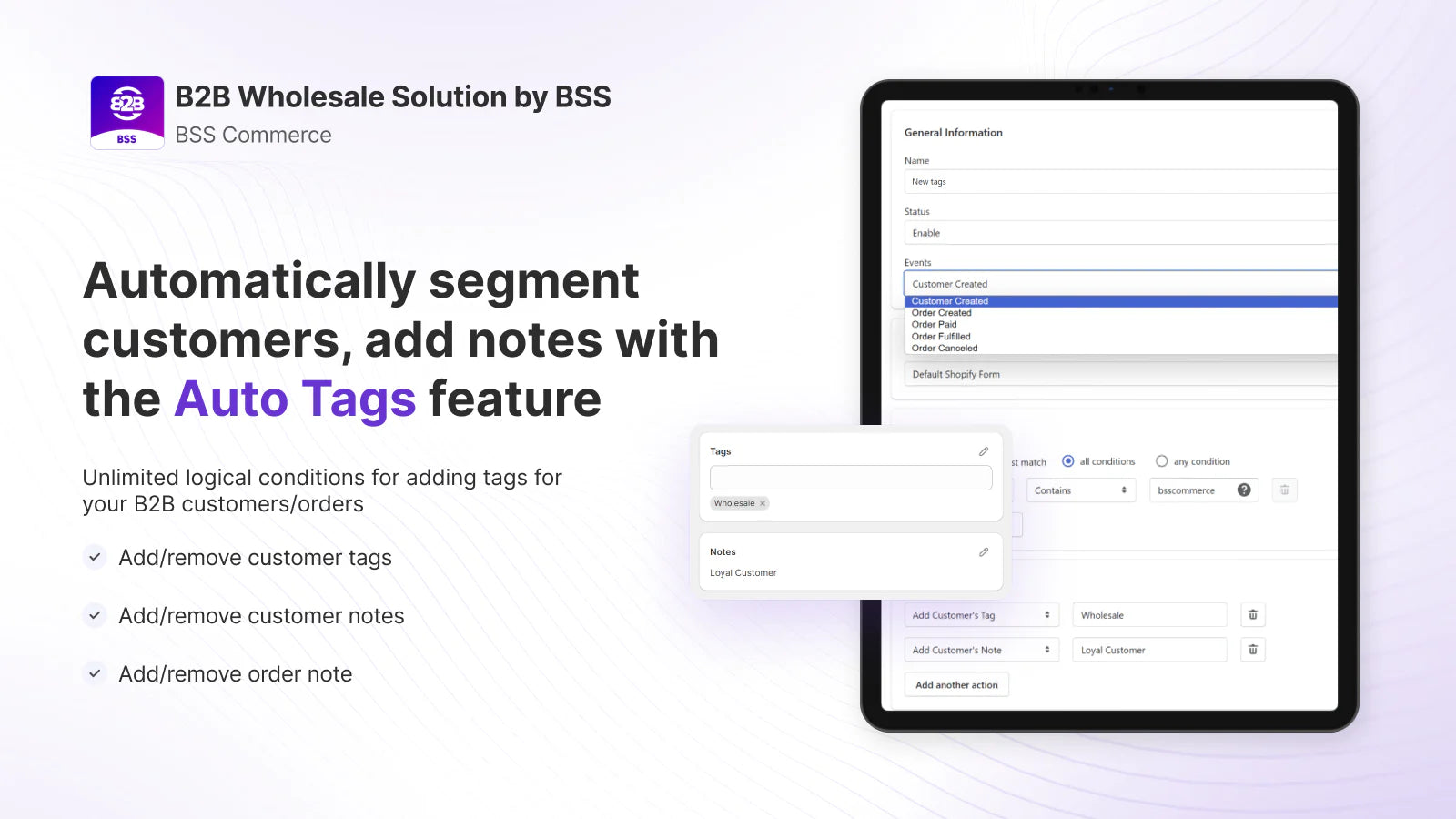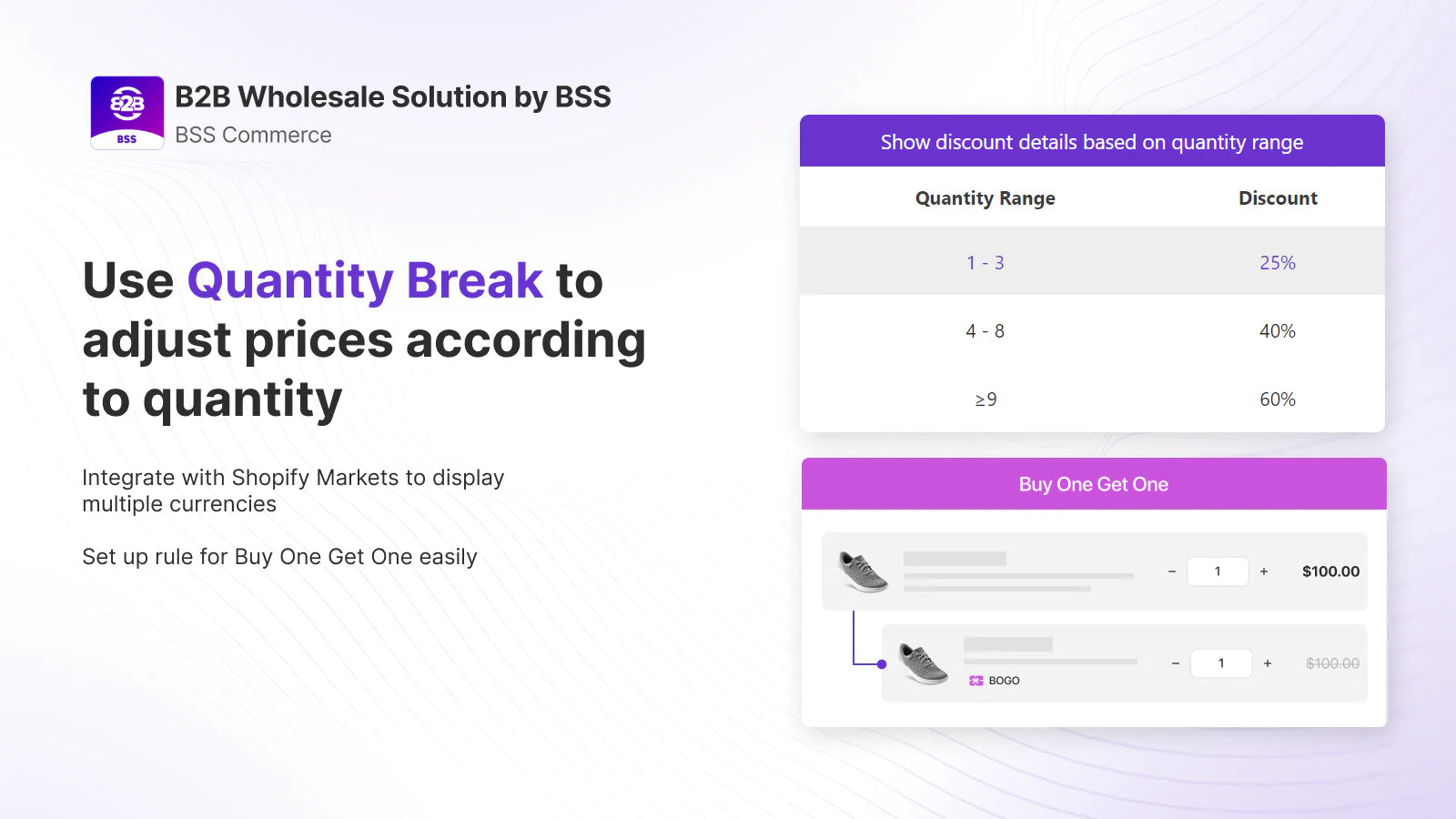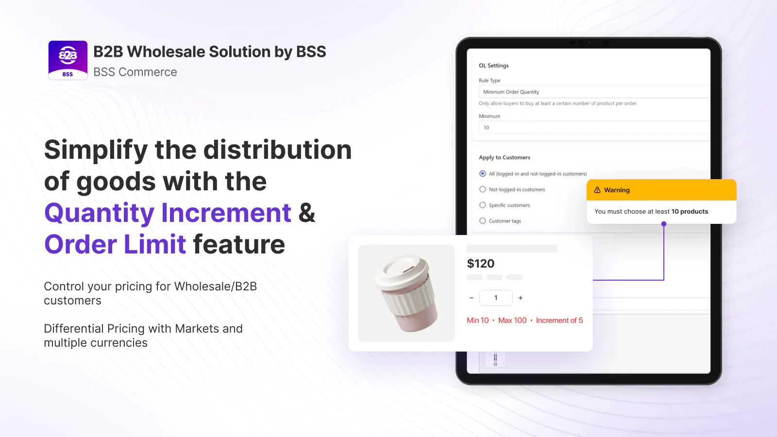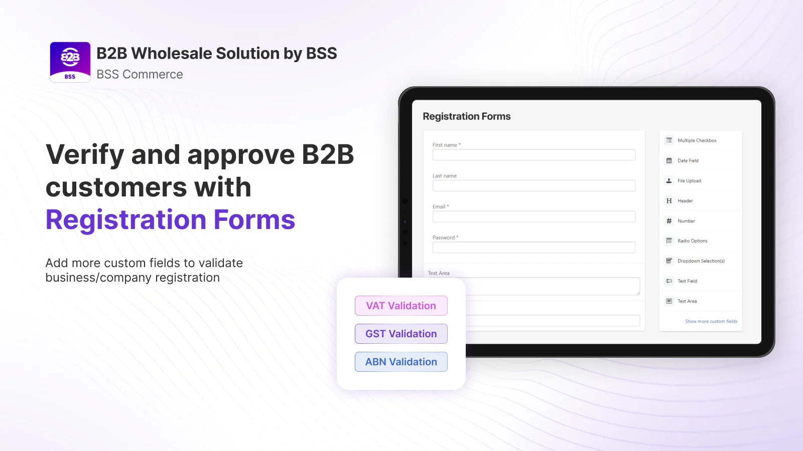 BSS: B2B Wholesale Solution offers an all-in-one toolkit for Shopify stores looking to streamline their B2B sales. This powerful app enables wholesalers to create custom pricing, tiered discounts, and bulk pricing across selected products. Simplify account management with dedicated B2B registration forms for wholesalers, ensuring easy VAT and tax-exempt pricing options, including automated EU VAT exemptions. Additional features like minimum order quantities, order limits, multi-currency support, and discount codes make this app ideal for a seamless wholesale experience. Perfect for managing customer data, taxes, and enhancing the B2B shopping experience.